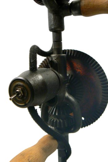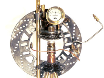 Le point de départ de cette lampe est l’abat-jour. C’est une bande de laiton ajourée à l’emporte-pièce industriel, récupérée et qui à l’origine devait être jetée. De petites ailettes en laiton provenant d’une vielle pompe, permettent de maintenir l’ensemble constitué de trois parties. Pour le pied, une grosse hélice en bronze provenant également d’une vielle pompe de relevage. Avec les ailettes, c’est une autre partie des trésors récupérés lors de mon escapade Bretonne. Il restait à assembler les deux. Le cuivre est apparu comme une évidence. J’affectionne tout particulièrement le mélange de ces trois matières. Faire un montage beau et cohérent a nécessité pas mal de travail. CVla m’a pris beaucoup de temps avant de trouver le montage définitif. Enfin, une grosse ampoule cuivrée pour l’éclairer.