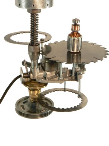 L’association de l’acier du cuivre et du laiton est pour moi une évidence. C’est encore le cas avec ce nouveau montage composé principalement de ces trois matières. Lors de mon escapade à Corme-écluse, j’ai rapporté ce rétroviseur vintage récupéré sur une jolie petite sportive anglaise et qui est devenu cette magnifique tête de lampe. Le corps est composé de deux pignons de vélo, fixés par plusieurs pièces de cuivres et laitons. Le tout est surmonté d’un petit manomètre gradué en ampère récupéré, lors d’une brocante, en très mauvais état sur un chargeur de batterie des années 30. Un disque de frein de moto fixé à l’arrière termine l’ensemble et donne l’harmonie au montage. J’ai gardé les teintes d’origine pour conserver le coté ancien, sauf pour le rétroviseur, une fois nettoyé il était un peu trop brillant. Je l’ai donc teinté à la crème de ferronnerie et recouvert le tout d’un vernis satiné. Dans un style steampunk vintage ce luminaire est unique. Comme tous les autres d’ailleurs.